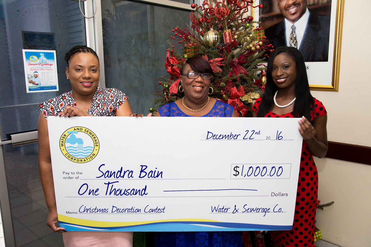 Nassau, Bahamas – With the Christmas decorations coming down on houses across the country, one happy resident may show off her décor a little bit past the twelfth day of Christmas. Sandra Bain, a long time resident of Sea Breeze, was judged as the winner of the Water and Sewerage Corporation’s (WSC) and Miya Bahamas’ Christmas Decoration Contest 2016.